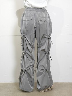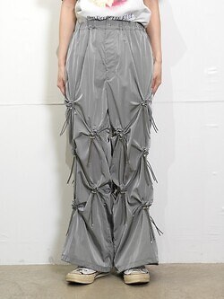 Pants made of shaka material with drawcords positioned all over the legs.